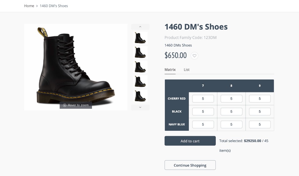 Product families listed in the B2B portal catalog will be shown here and can be searched using the search box. The customer can enter the variant quantities into the matrix. The option type with the fewest options will be displayed on the horizontal axis, while the option type with more options will be displayed on the vertical axis for ease of display on the screen.