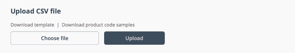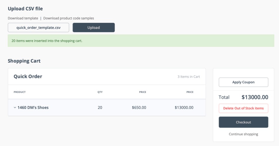 Customers can enter the product code, product name, and required quantity into the blank template, or edit the quantities of the product code sample template, then save the CSV file. On the Quick Order page, click Choose file to select the saved file from your computer or device, then Upload to add the items to the shopping cart.