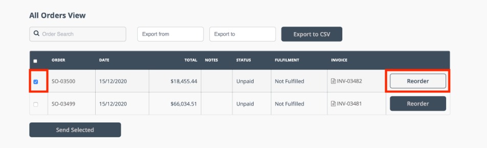 Customers can repeat orders from the All orders page. Open the My account dropdown menu and select All orders. Users can also access this page by following the All orders link in the page footer. Check the box next to the order/s to be repeated and click Reorder to copy the items from that order into the shopping cart. From here, the checkout process is completed as normal.