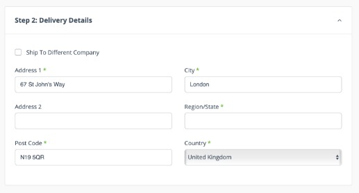 In Step 2, the customer enters a Shipping Address. If the customer already has a shipping address on record, it will be entered here automatically. Use the Ship to Company function to also enter a company and contact name, if required.