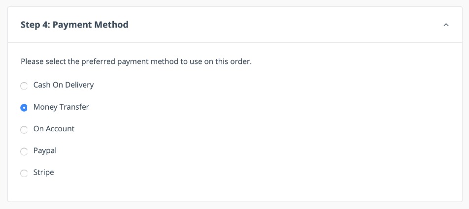 In Step 4, the customer selects a Payment method. Payment methods are added when setting up the B2B portal.