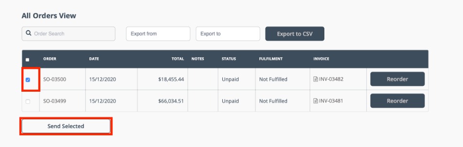 Alternatively, check the box next to one or more orders, then click Send selected to open a popup window. Enter an email address and click send to send the invoices via PDF attachment.