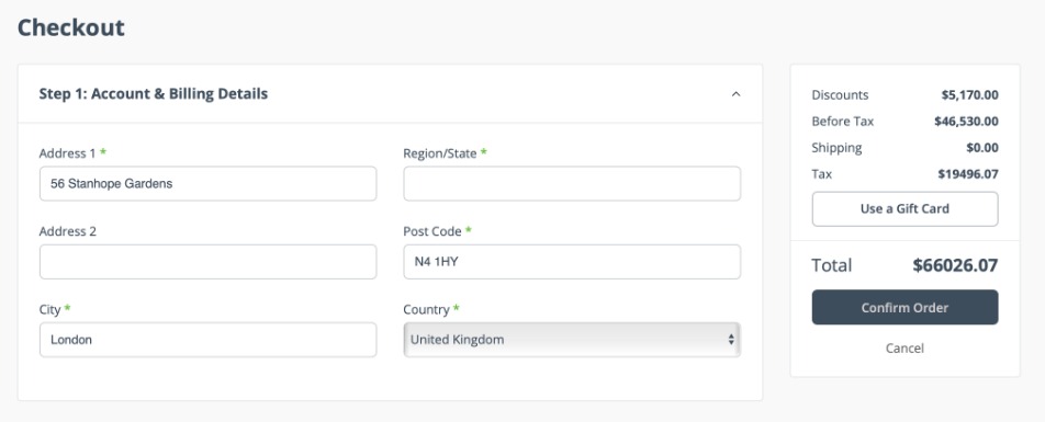 In Step 1, the customer enters a Billing Address. If the customer already has a billing address on record, it will be entered here automatically.