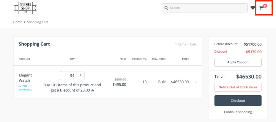 When the user is ready to finish the order, they must click the shopping cart icon to view the cart and begin the checkout process. Coupons can be applied at this stage. Click Checkout to proceed.