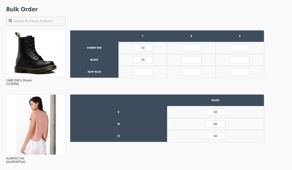 Bulk orders allow the customer to quickly enter multiple variants (size, colour) of product families when making a single order.