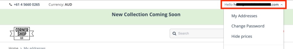 Users can access account features such as managing addresses, managing orders, and changing the password by opening the My Account menu. Simply click the username at the top of the screen to open the My Account dropdown menu.
