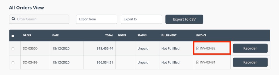 From the All Orders page, customers can click the invoice field of a line to download the invoice for that order in PDF format. Open the My account dropdown menu and select All orders. Users can also access this page by following the All orders link in the page footer.