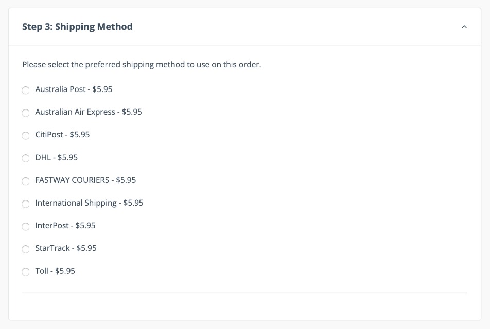 In Step 3, the customer selects a Shipping method. Shipping methods are added when setting up the B2B portal.