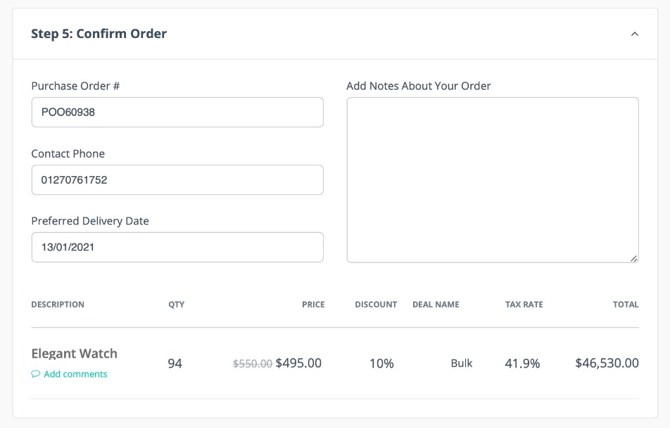 In Step 5, the customer confirms the order, optionally entering a PO number, required by date and notes.