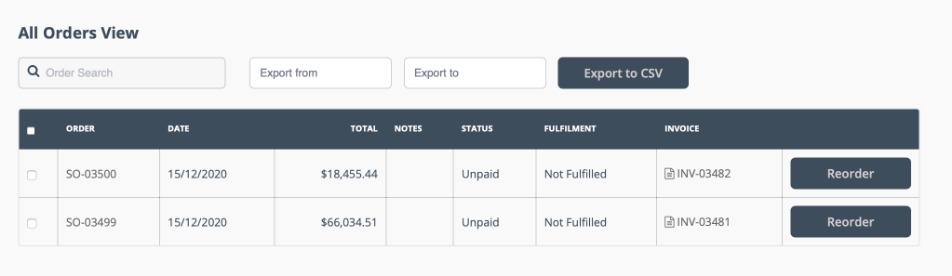 This page shows information for each order with its payment and fulfillment status. Customers can search for an order number using the top-left search box and export order details in CSV format.