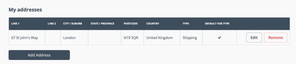 Add or remove addresses from your account by clicking the username to open the dropdown menu, and select My Addresses. Users can also access this page by following the My Addresses link in the page footer. Addresses that are already added to this customer's profile will be shown on this screen automatically.
