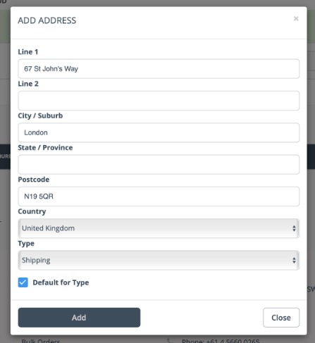 Click Add Address to open a pop-up window and enter a new address. Click Add to add the address to the customer's record in Cin7 Core.