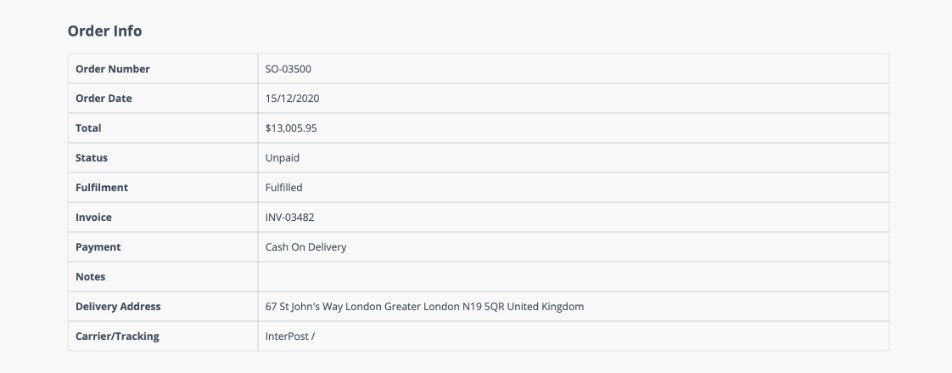Clicking an order opens up more detailed information including delivery address, products ordered, tax, additional costs etc. Carrier information and tracking number are displayed here when they become available.