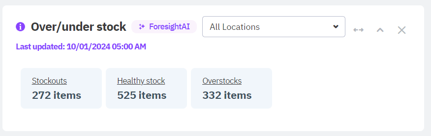 The Over/under stock dashboard widget displays the current number of items in stockout, overstock, and healthy states in each location.