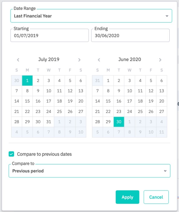 Select the date range for the dashboard display from the dropdown menu. You can also select to compare the dashboard data to data from the previous period or previous year. This will only affect the KPI section and Purchases, Bills and Orders section. Comparison will show as a percentage in increase or decrease next to listed values.