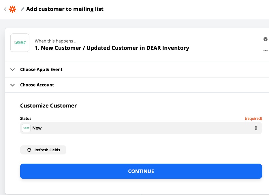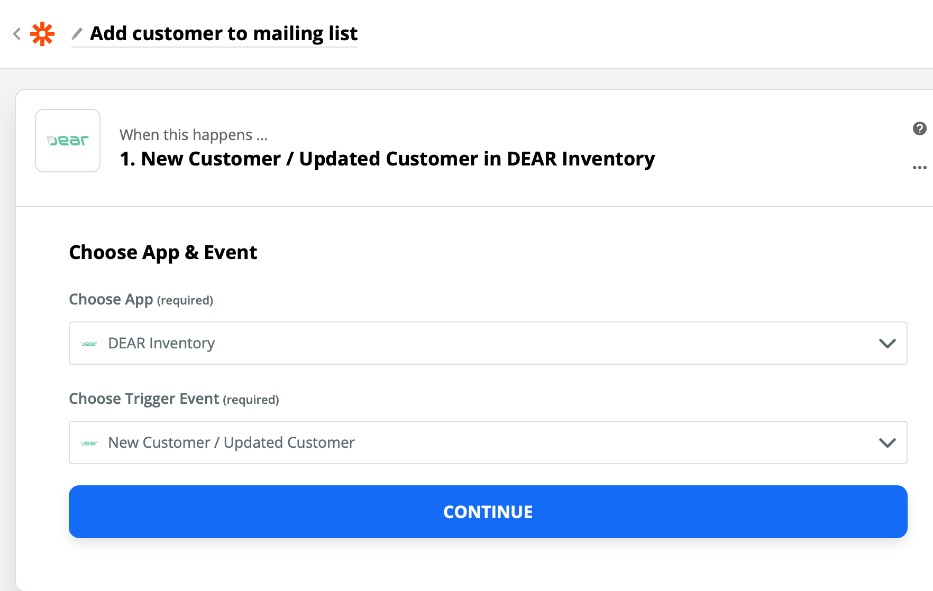 As an example, we will set up a Zap that is triggered when customers are created in Cin7 Core, then subscribes the new customer to a mailing list in MailChimp.