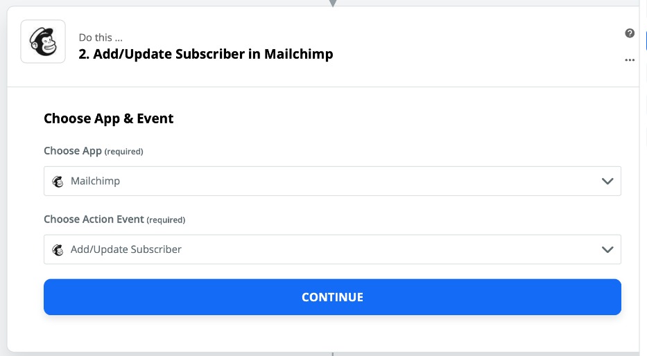 Select a MailChimp action from the list. For example, Add / Update Subscriber, which adds a subscriber to a MailChimp mailing list.