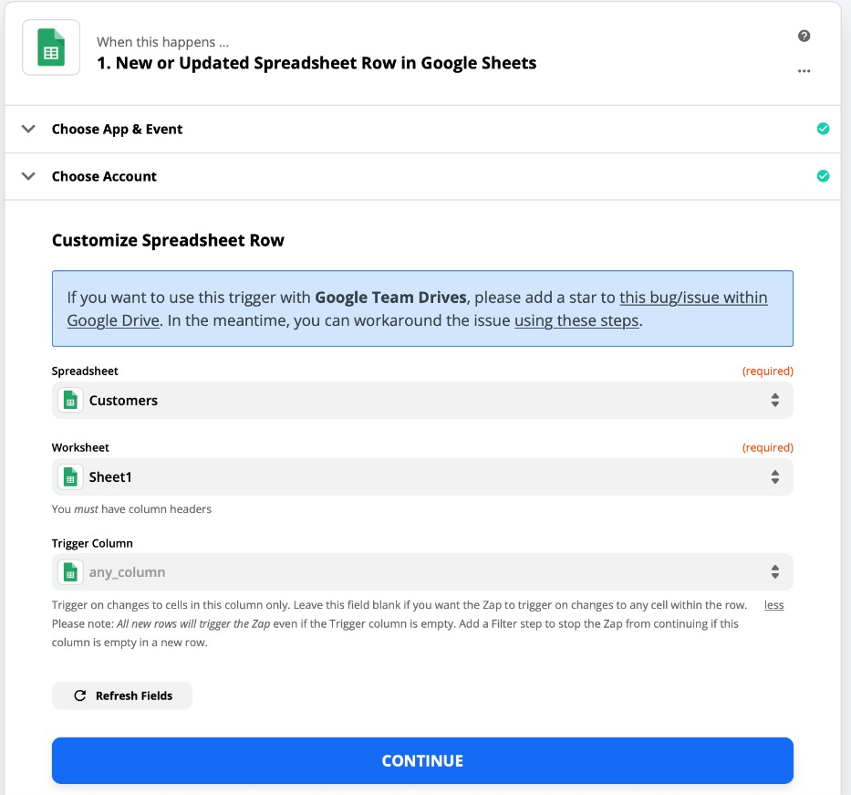 Back in Zapier, set up the template for the trigger by selecting the spreadsheet and worksheet from where data will be taken and push to Cin7 Core. Optionally, you can select a trigger column, which means that only changes in this particular column will trigger the zap and push information to Cin7 Core.