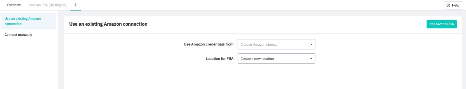 Under the Use an existing Amazon connection tab, select the Amazon store to be connected to Cin7 Core and the warehouse location to be used for external fulfillment from your list of warehouses. If you do not want to use an existing warehouse location, leave the already selected Create a new location option as is, then click Connect to FBA. At the moment only one location is available per FBA connection.