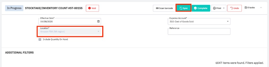 Click the Sync button at the top of the screen. All the inventory quantities from FBA are then imported into Cin7 Core.