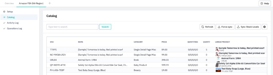 The catalog for each FBA external fulfillment location can be viewed in Integrations → FBA → Catalog. Click Force Sync to synchronize product information between the services. To synchronize product quantities, click Sync stock levels.