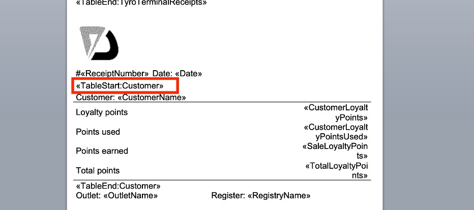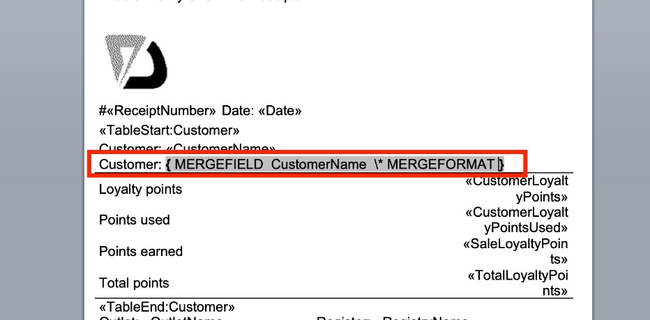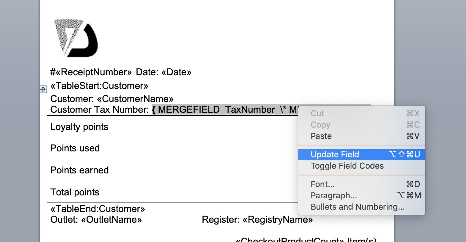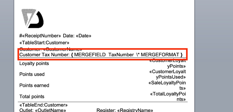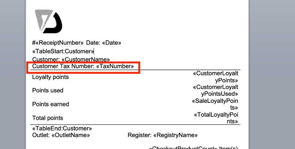 Replace the CustomerName field with TaxNumber field (Field codes are available in MailMerge fields for Cin7 Core POS templates).