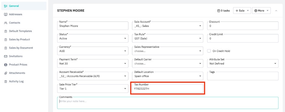 In the Cin7 Core web portal, you will need to go to the General tab of a customer's record (Sales → Customers and credits → [select customer]) to enter or edit their tax number.