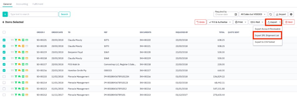 Alternatively, you can manually export a 3PL Shipment List from the Sales page to give to your 3PL provider. This downloads information required by 3PL providers in .csv format
