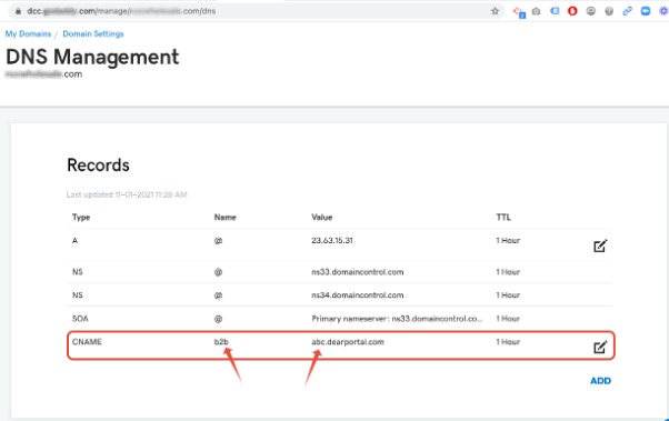 Second-level: In this situation, the customer wants to load the second-level domain. abc.dearprotal.com → b2b.abc.com. A CNAME record should be added which points it to the B2B portal (abc.dearportal.com for our example).