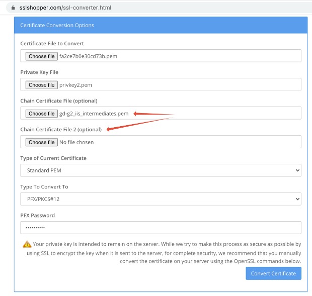 Chain Certificate File 2 (optional): If your SSL provider gives you Chain Certificate Files, please use the by converting them to the correct format. There Chain Certificate Files will further validate the SSL files.