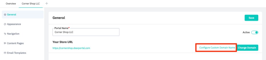 Configure the DNS: You will need to create an entry on your domain hosting provider's DNS server that points to your B2B Portal permanent address (<your_portal_name>.dearportal.com).