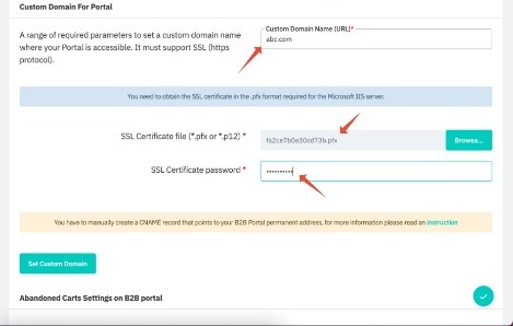 Setting up the Custom domain in Cin7 Core B2B: In Cin7 Core, enter the custom domain name and SSL certificate to complete binding the custom domain.