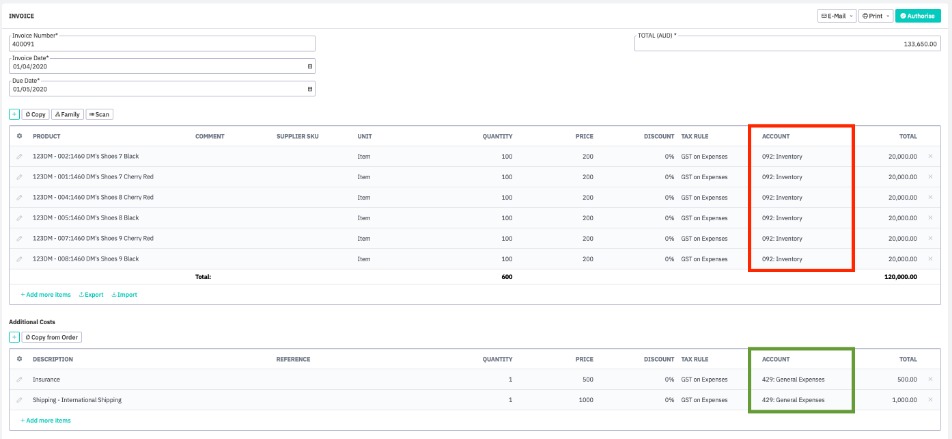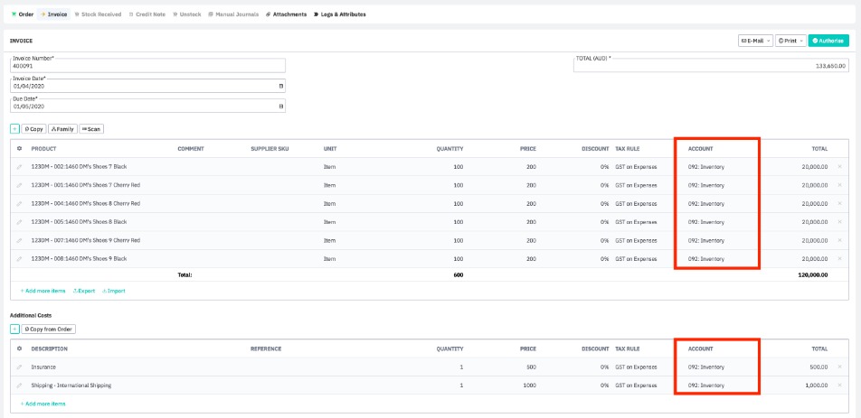 To allocate additional costs to products on a purchase order, make sure that the additional cost account is the same as the inventory account for the products.