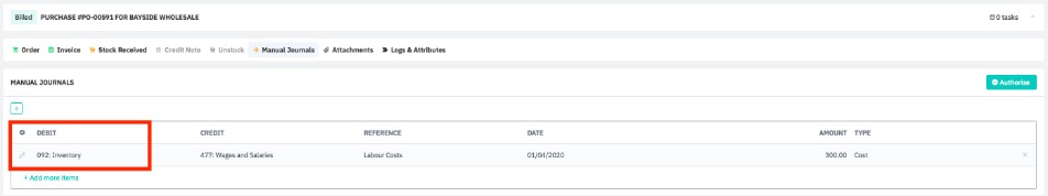 Manual journals can be used to allocate expenses to products during Purchases, Stock Transfers, and Assemblies. Allocated expenses will increase the stock on hand value of your inventory.