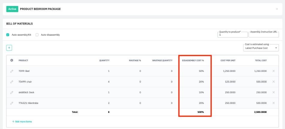 You can change this by editing the Disassembly Cost % on the Bill of Materials for the assembled product, as shown below. The Cost per Unit and Total Cost (per line) is estimated using either Average Cost, Latest Purchase Cost or Fixed Purchase Cost, and cannot be edited manually. You can use the Total Cost per line/Total Cost to set the appropriate Disassembly Cost % for the components.