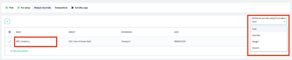 Journals are distributed according to the product cost. A planned Cin7 Core update will expand the available options for cost distribution.