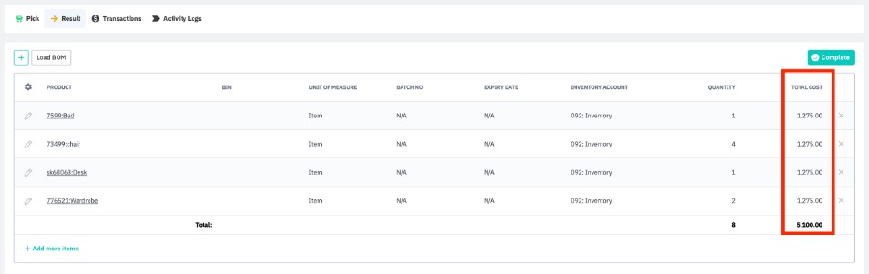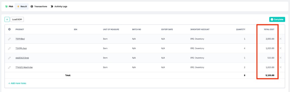 Note: The BOM for the finished product estimates a cost using either Average Cost, Latest Purchase Cost, or Fixed Purchase Cost. This is for your reference only. The actual cost of finished goods will be calculated using the costing method of each individual component allocated to an assembly and can vary from "Total" cost displayed in the BOM.