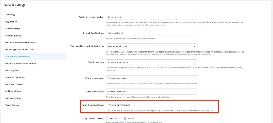 By default, the ship date is set to Today (or the date the ship tab is authorized). You can change this setting so ship date is set to sale invoice authorization date. In this way, sale invoice date and COGS date will match up.