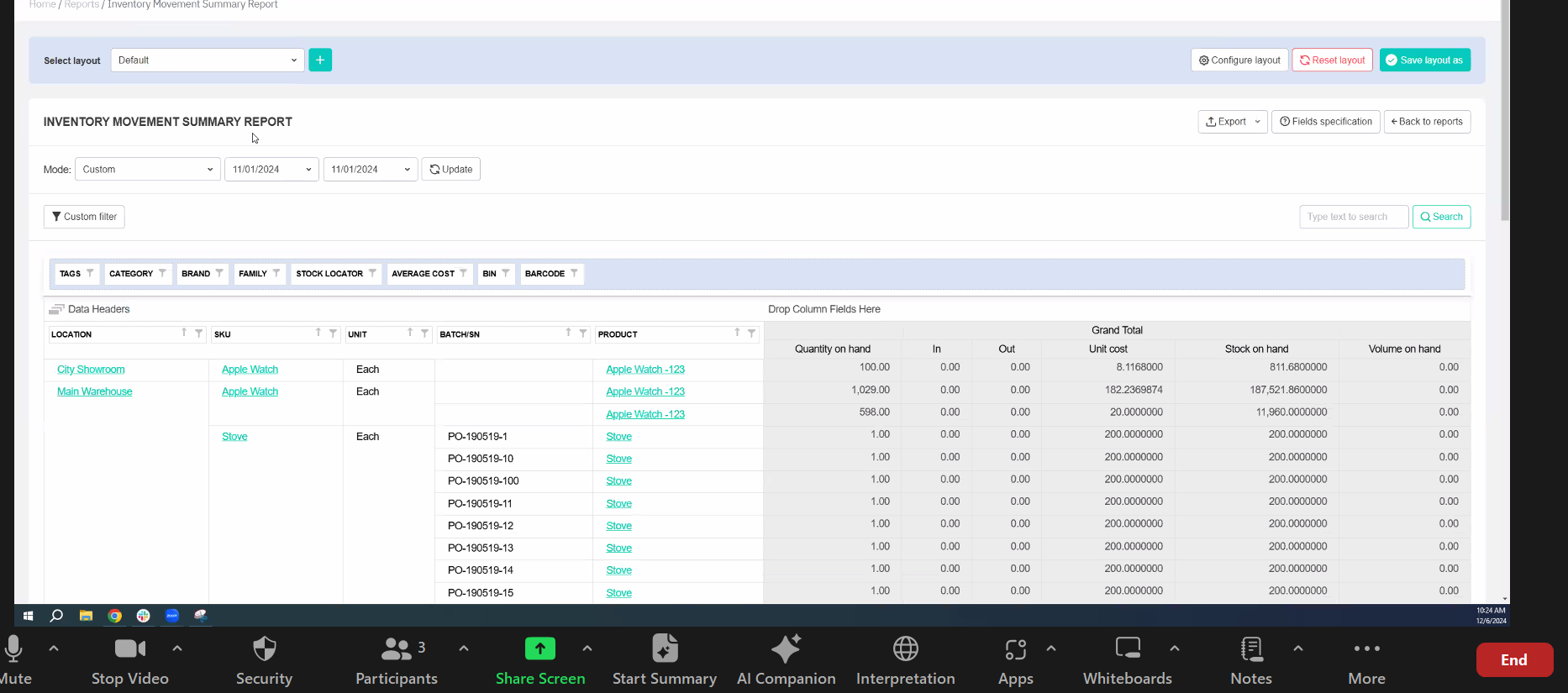 Stock on Hand - Value of the stock on hand as of the end date of the selected time period