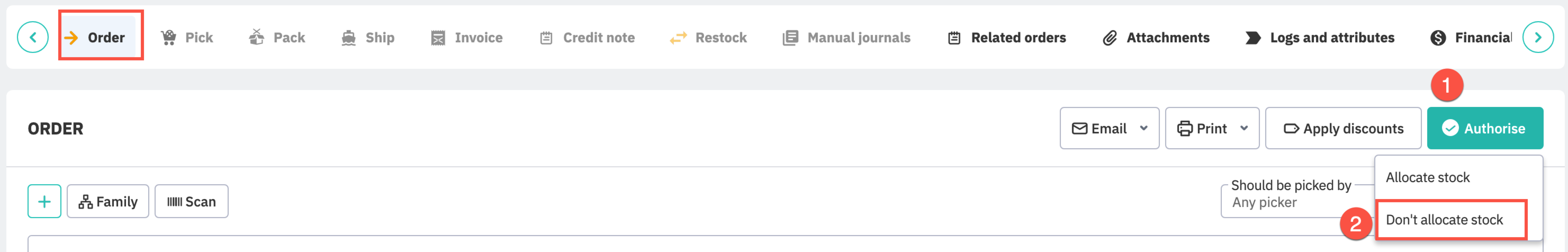 Screenshot #1: Initially Authorise with “Don't allocate stock”