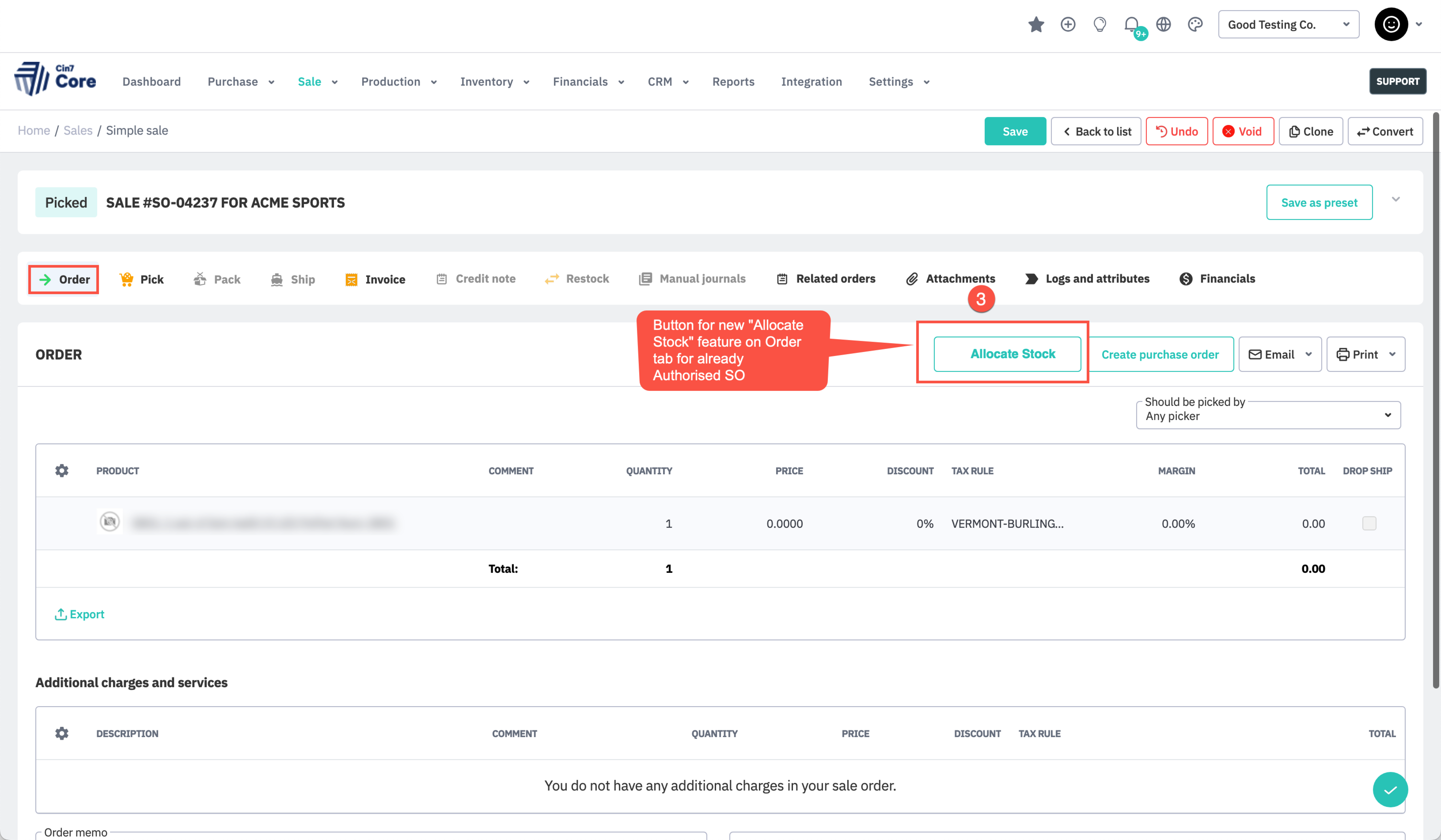 These businesses use the General Setting "Make stock allocation optional" set to Optional and choose "Don't allocate stock" option when Authorising the sale. See Screenshot #1 below. Later, when the order is ready for fulfillment processing, they want to be able to allocate stock in CORE, but are not ready to specifically pick the stock. In some ways it is similar to the General Setting feature "Make stock allocation optional", but delayed choice of allocating stock.