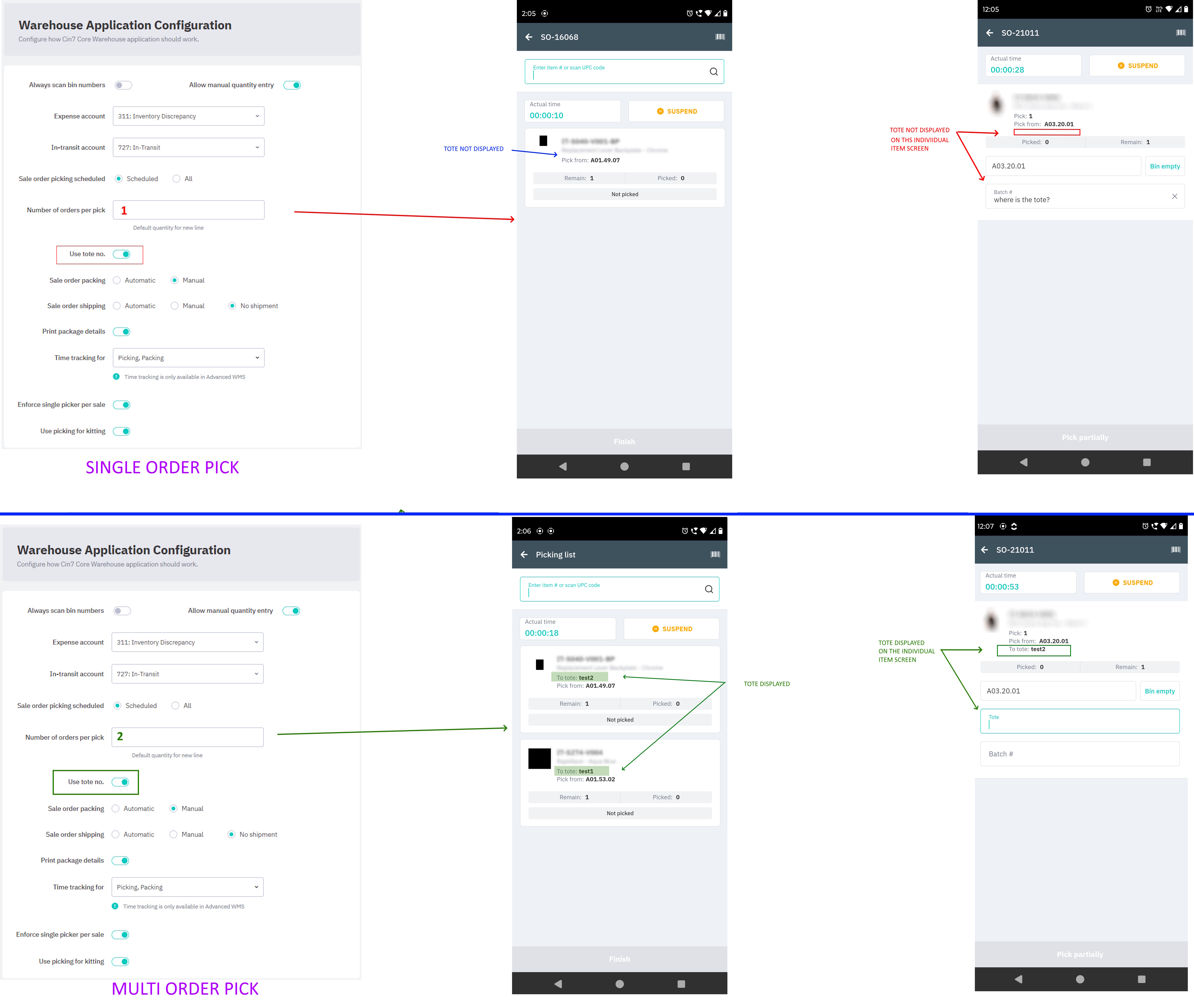 - Display the tote on the Pick screen for each item, when picking a single order