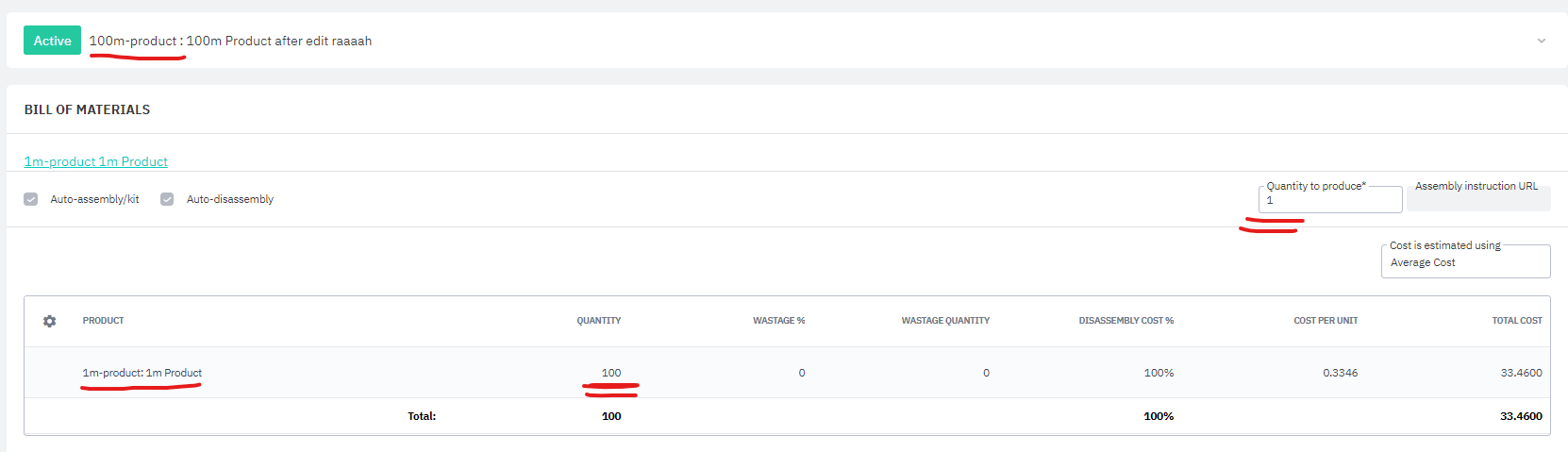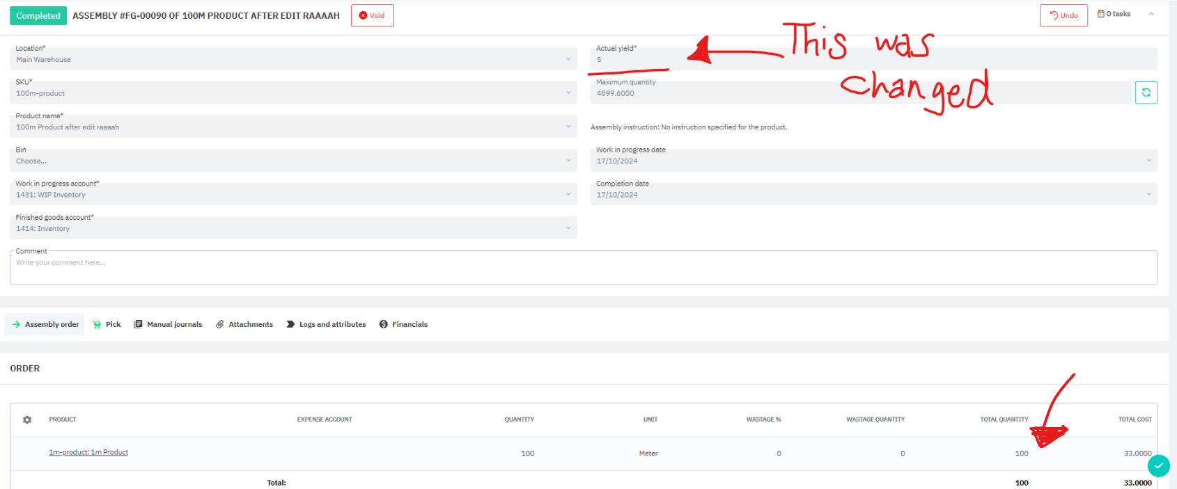 FG-00090 was initially processed for 1 unit of 100m-product (100 units of 1m-product), but after authorising the assembly order, it is possible to change the actual yield, meaning that the output does not tally to that of the consumed components, as per the BOM.