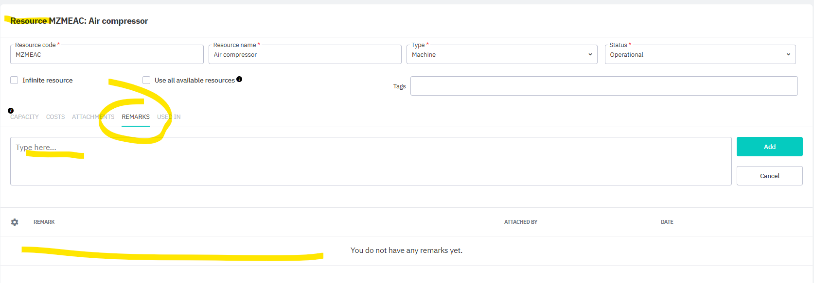 My idea is to be able to enter a service purchase, for a technicians invoice and tag the resource (machine) that this invoice was for, so that a link to the invoice and maintenance record would automatically populate in the remarks section of the particular resource.