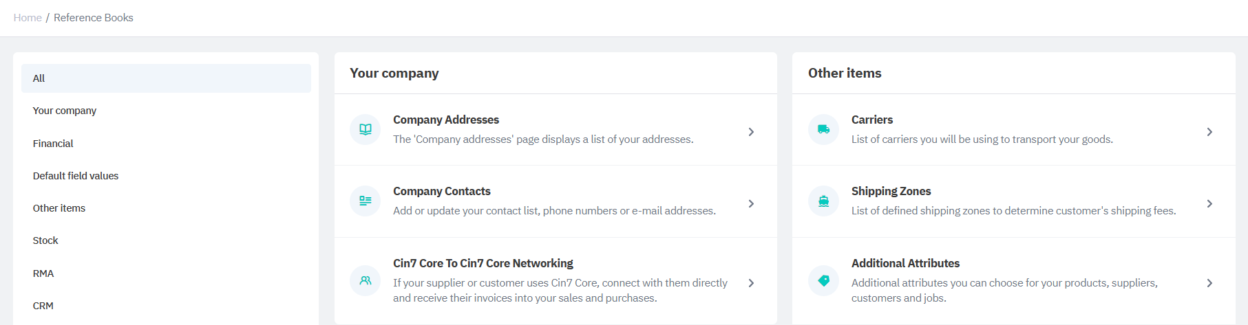 Product Attributes can be created from the Reference Books section of your Cin7 Core account. To access this select the Settings gear from the left hand menu. Then select Reference Books. Next you can select Additional Attributes.