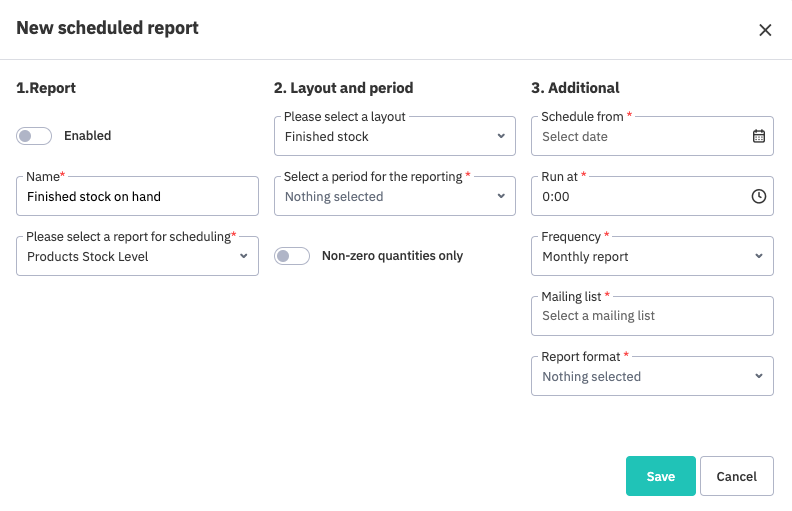 We need the option to be able to not only select the layout of the report but also to apply certain filters before it is sent. I don't need a report showing me every single nut & bolt we have in stock … I just need to know the finished goods!