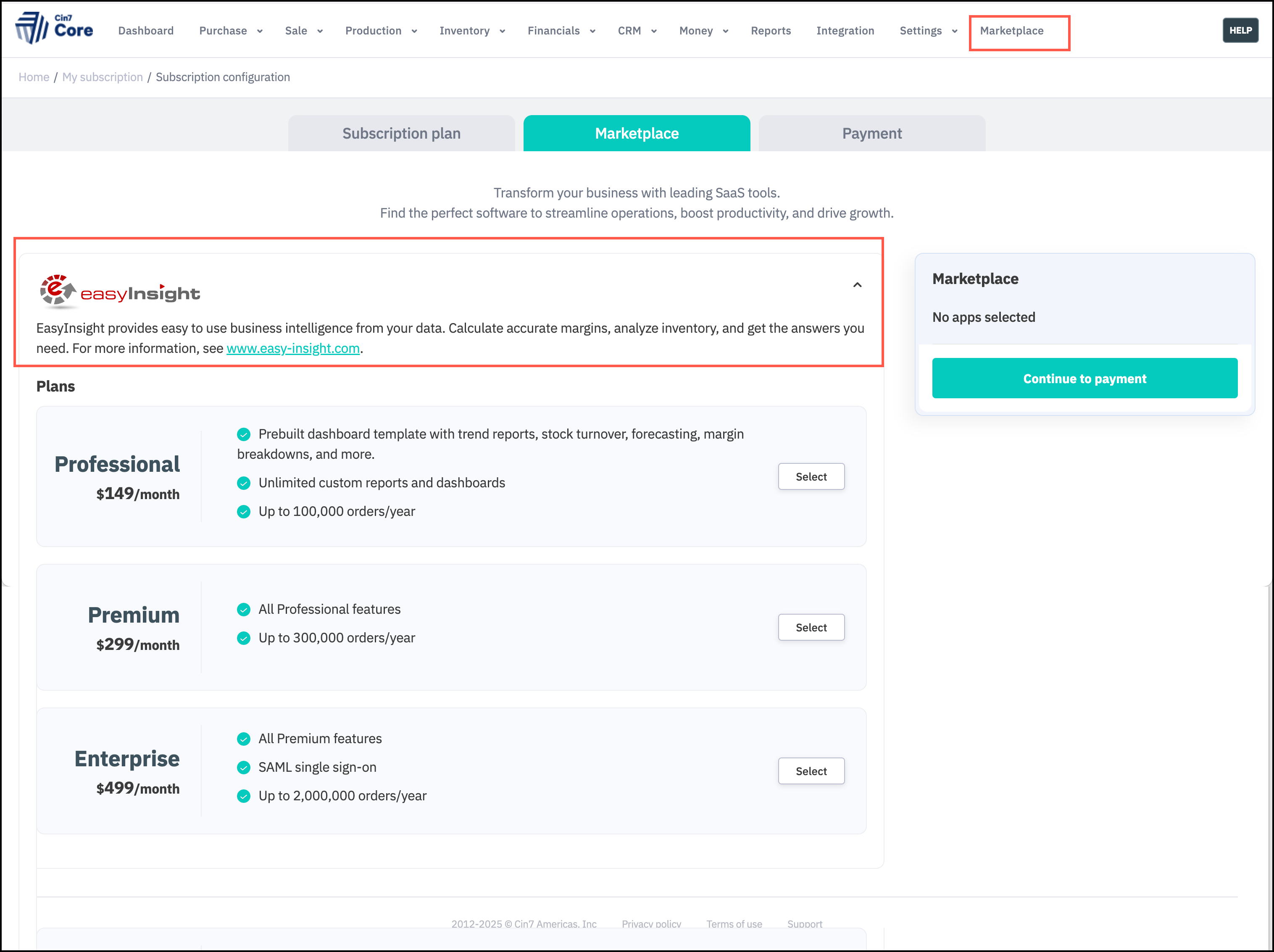 You can add Easy Insight directly in Cin7 Core by going to the Marketplace section - see screenshot below.