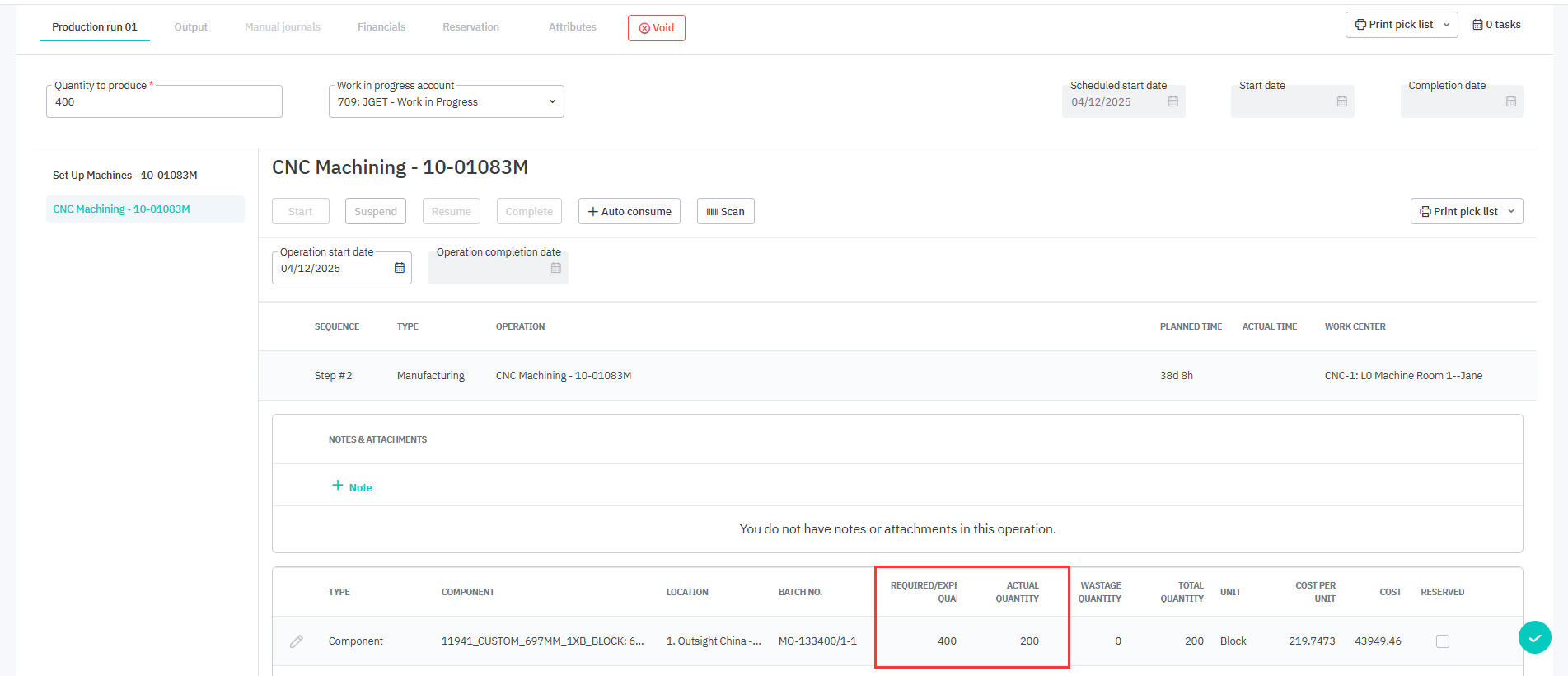 Ideally, a setting should be added: when production begins with the actual quantity less than the required quantity, the system should notify the user that the material quantity is too low and require the user to confirm again before production can continue.