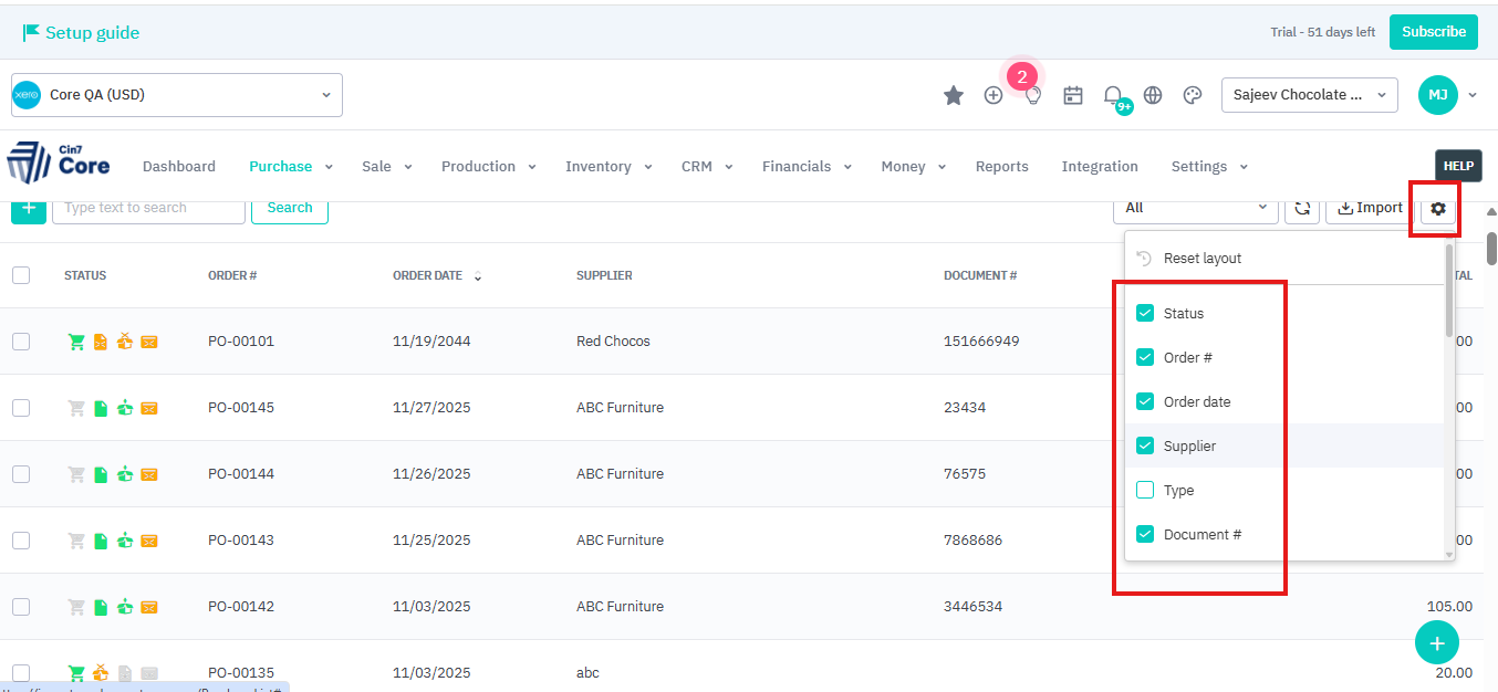 Purchase order list view