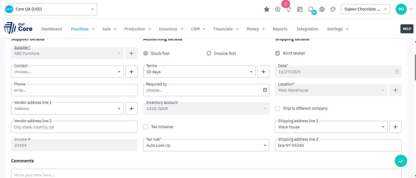Please refer to an example purchase order header.
